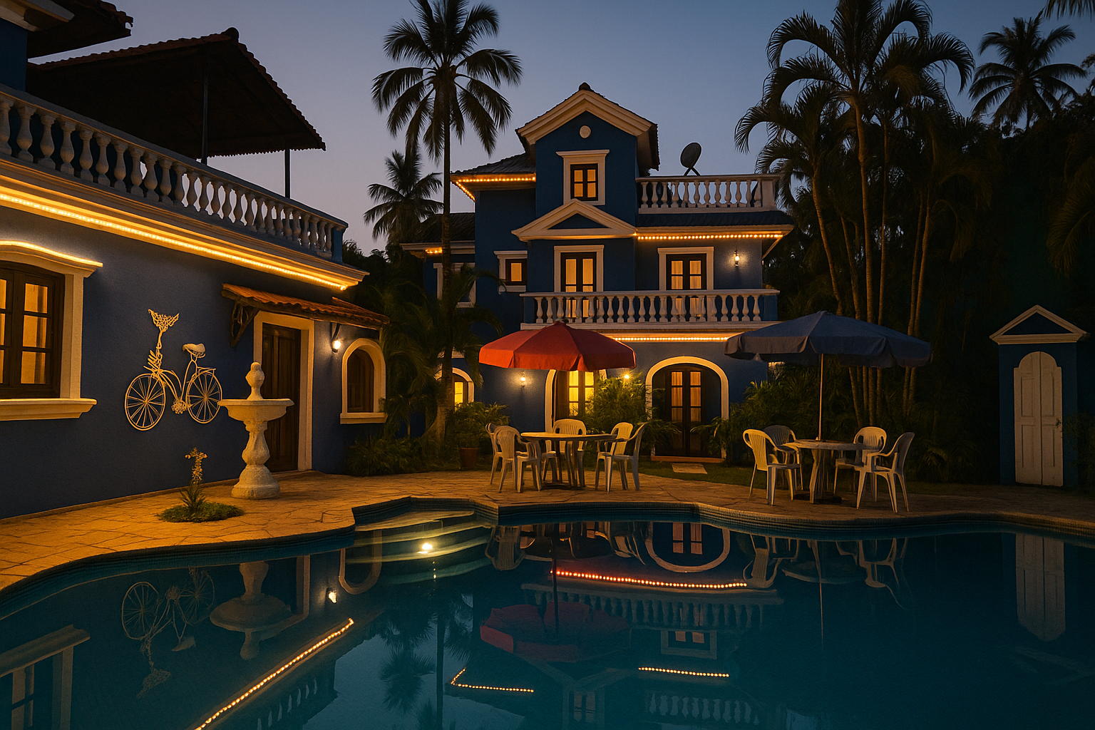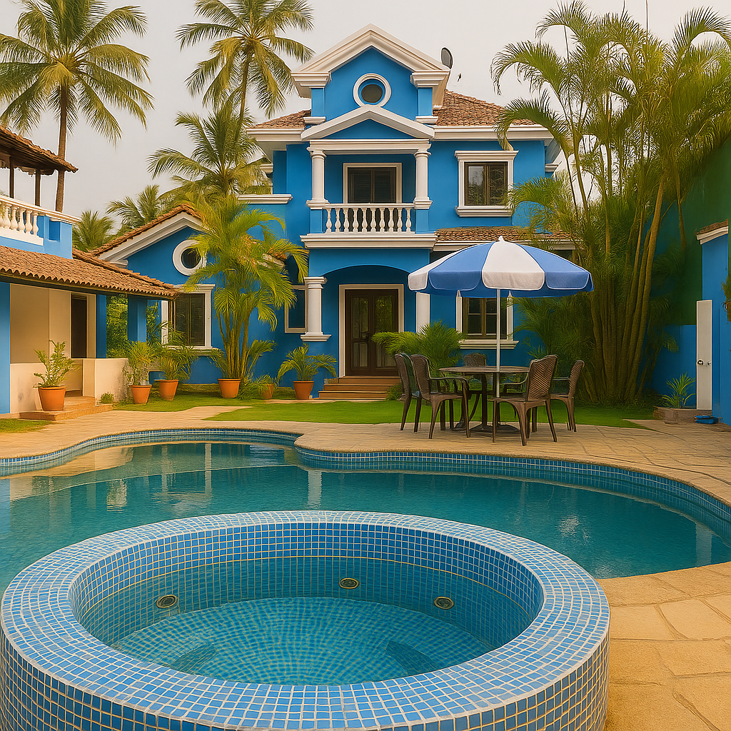 The 5 BHK villa is in a secured gated compound. The villa has a private swimming pool only for the exclusive use of guests. The guests can have food at the pool side dining area. A beautiful garden with lawn & flowers surrounds the villa.